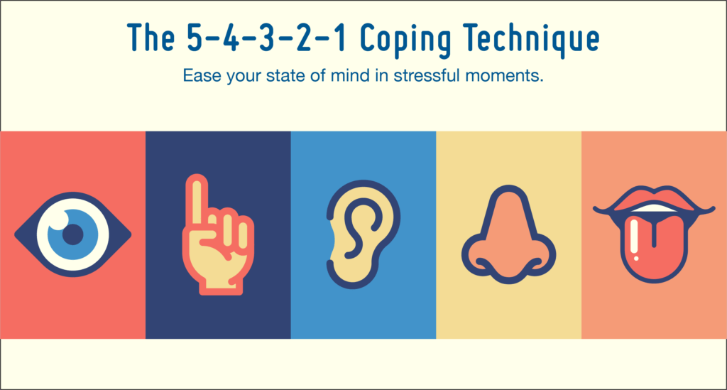 “Look around the room and do this without anyone knowing. You can be in a meeting or a crowded room. Identify five things you can see, four things you can hear, three things you can touch, two things you can smell, and one thing you can taste. This activates all five senses, bringing you back to your body and grounding you, helping regulate your nervous system.”